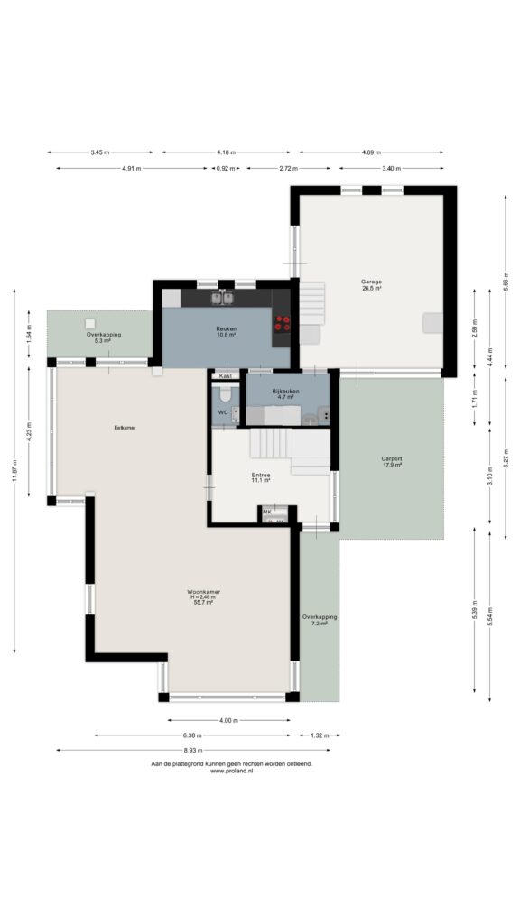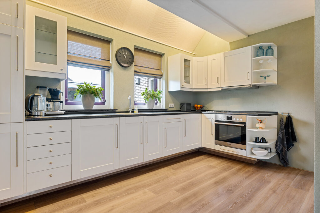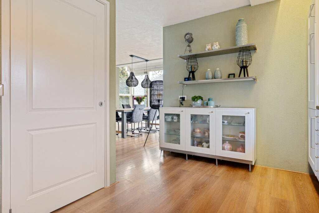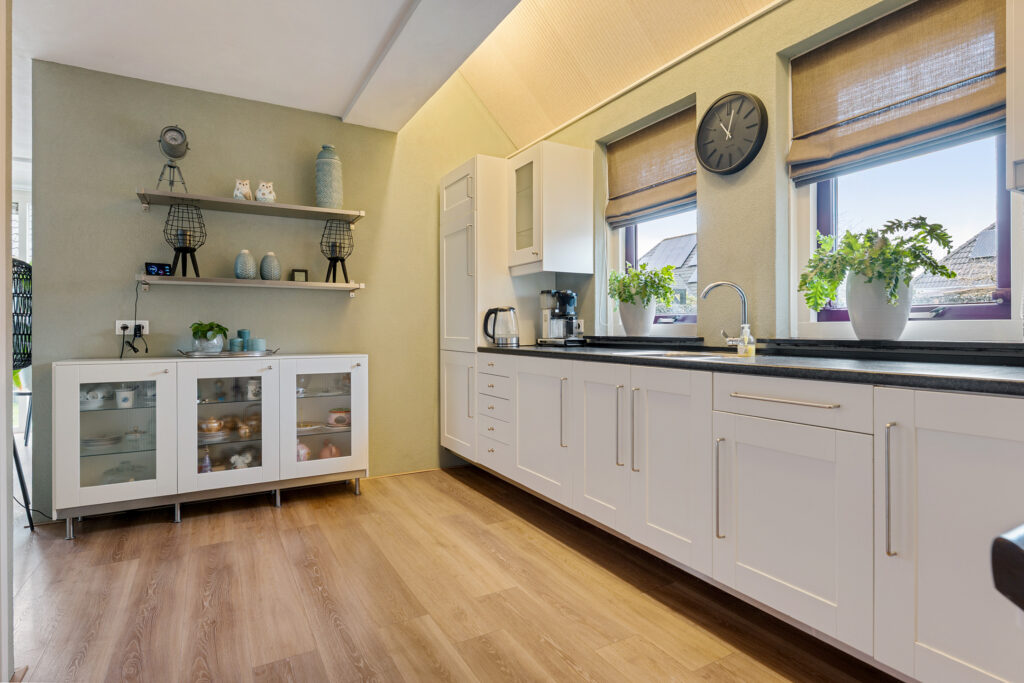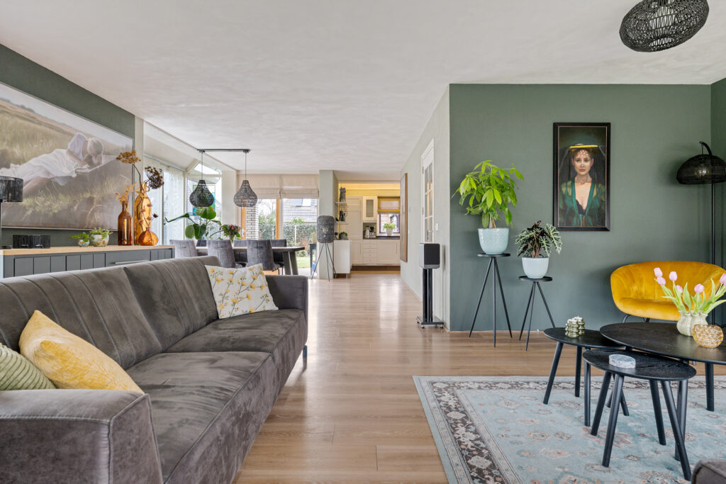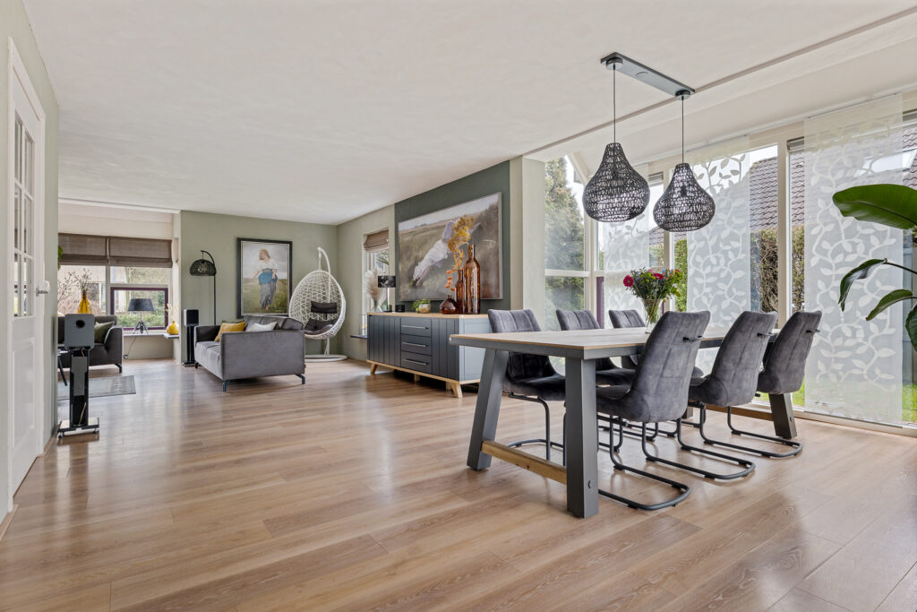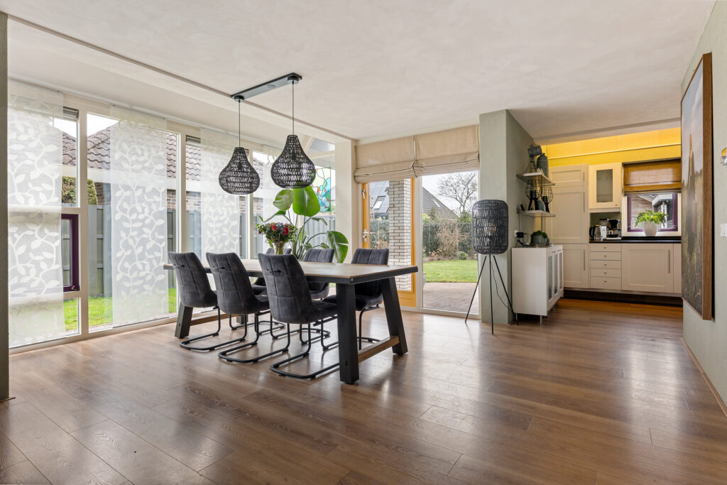 Indeling: entree, royale hal (ca 11 m²), meterkast, toilet en toegang tot de woon/eetkamer (totaal 56 m²) met veel lichtinval wat zorgt voor een prettig wooncomfort. Vervolgens de keuken (ca 11 m²) voorzien van inductie kookplaat, koelkast, magnetron en oven. Vanuit de keuken heb je toegang tot de bijkeuken van ca 5 m² met witgoedaansluiting, spoelbak en doorgang naar de garage van 27 m². Via een vaste trap in de garage kom je op de verdieping waar je toegang hebt tot een royale functionele ruimte (thans in gebruik als atelier) met pelletkachel (ter overname) en veel daglicht.