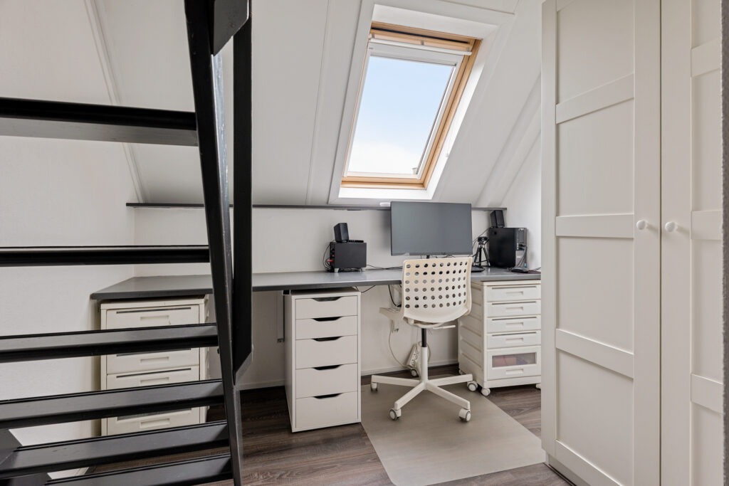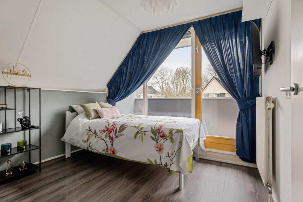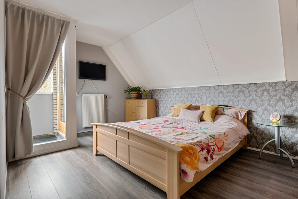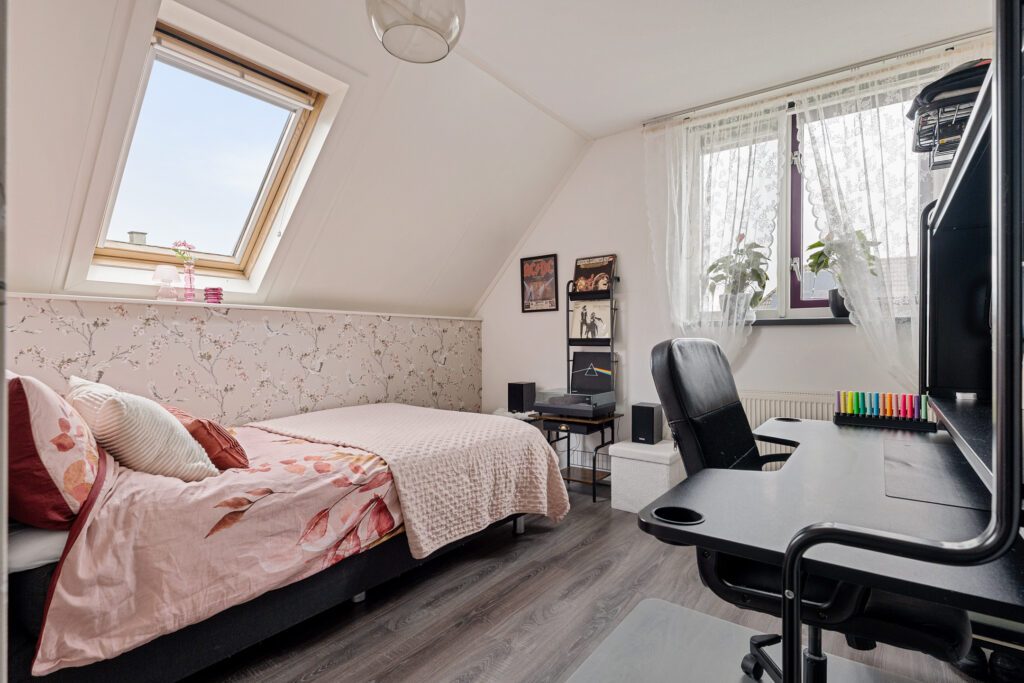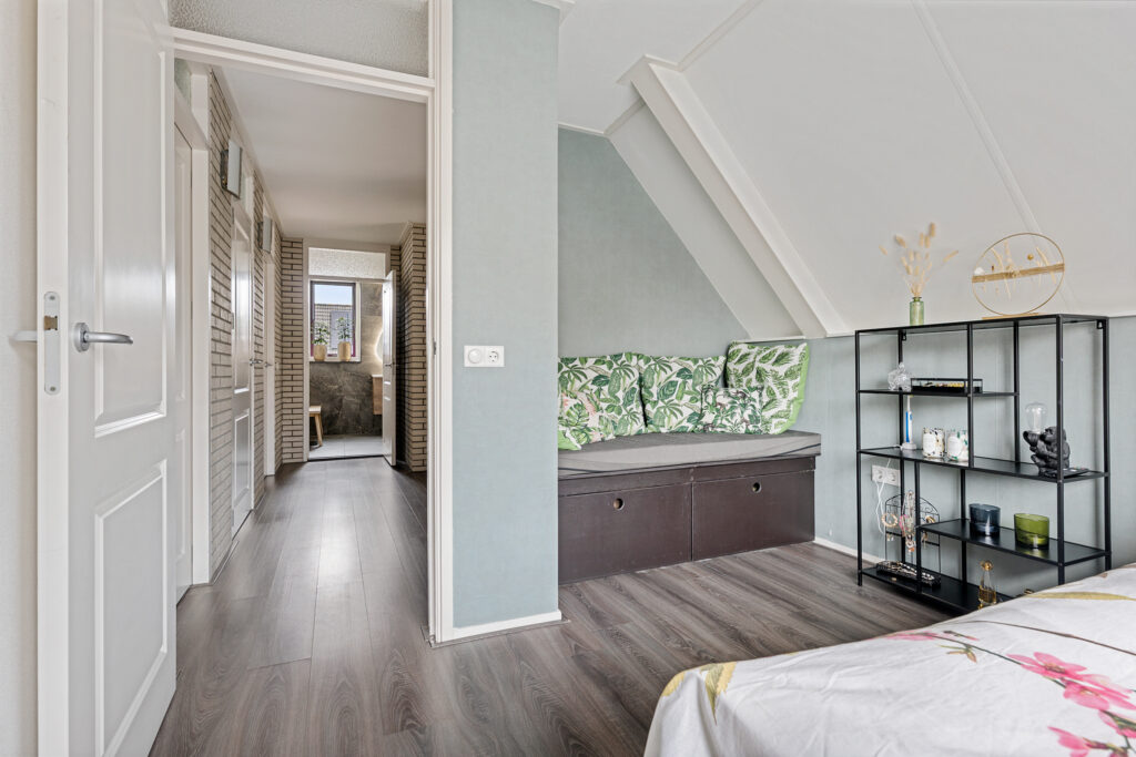 Op de verdieping van het woonhuis heb je via de overloop toegang tot studeer ruimte en 3 slaapkamers van ca 9, 11 en 13 m². Via de voorste slaapkamers heb je toegang tot het balkon aan de voorzijde van de woning. De keurige zolder die te bereiken is via een vaste trap in de studeer ruimte, is circa 11 m².