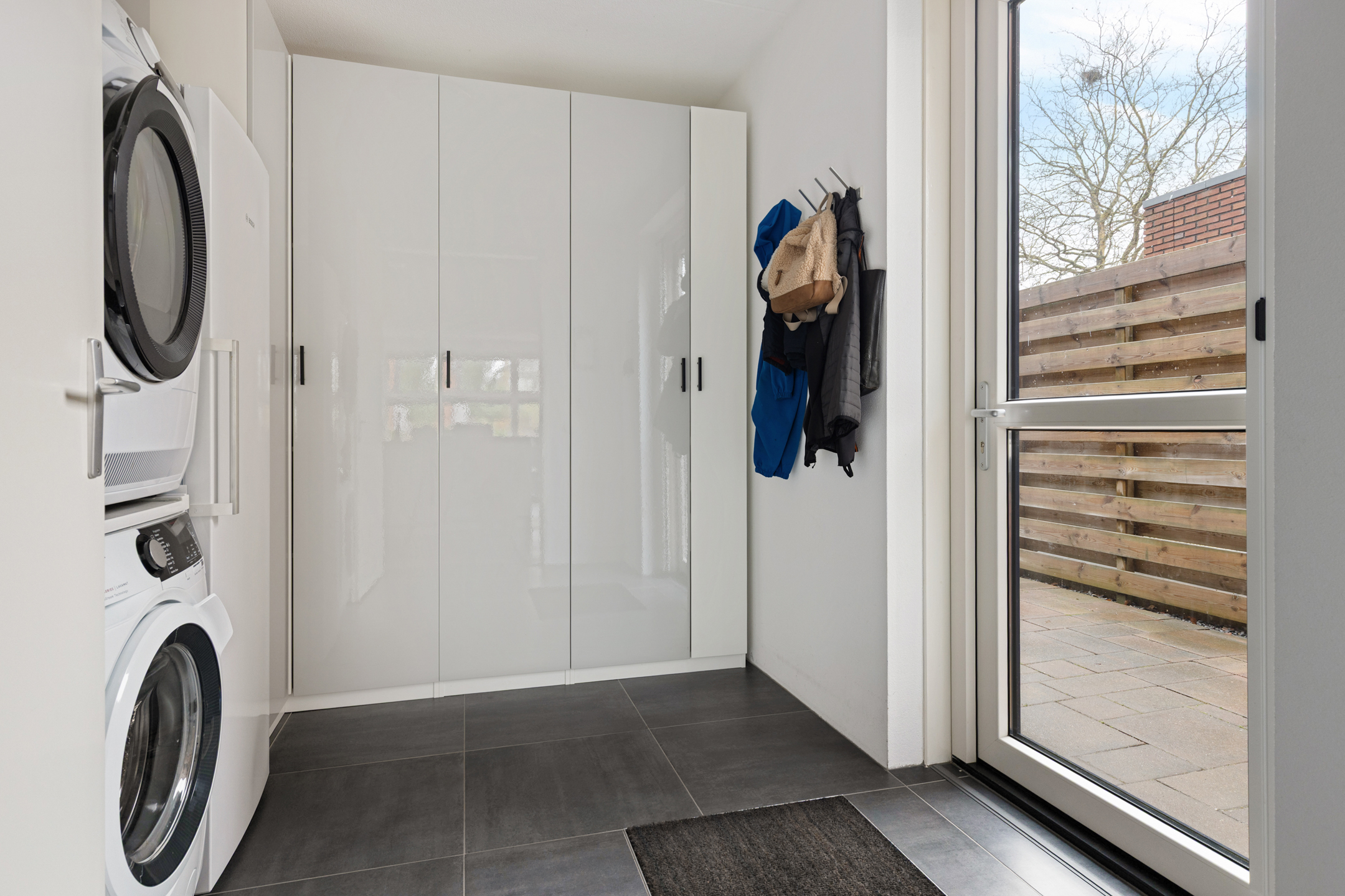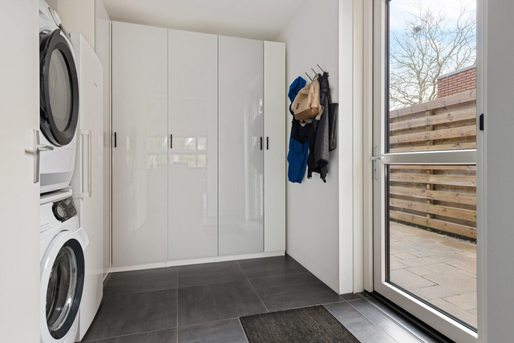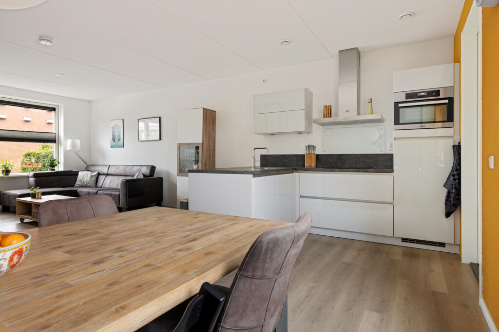 Entree, hal met toilet en toegang tot de woonkamer met aansluitend de keuken (gezamenlijke oppervlakte van ca. 37 m²) De moderne open keuken met spoeleiland is voorzien van divers inbouwapparatuur zoals een koelkast, inductiekookplaat met afzuigkap, combi-oven, vaatwasser en Quooker. Vanuit de keuken toegang tot de bijkeuken van ca. 8 m² met wasmachine-en drogeraansluiting en een waterontharder, en toegang tot de besloten achtertuin.