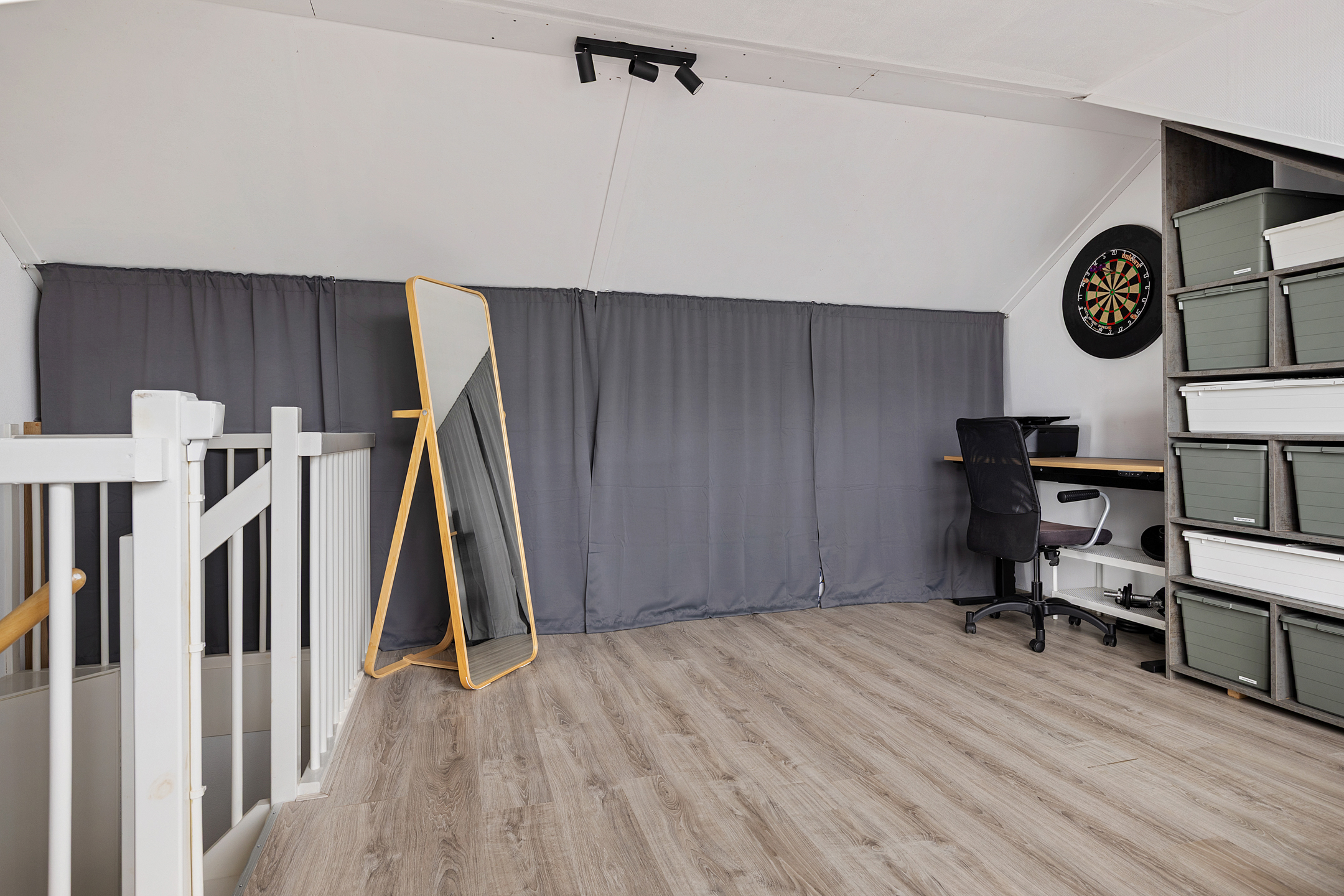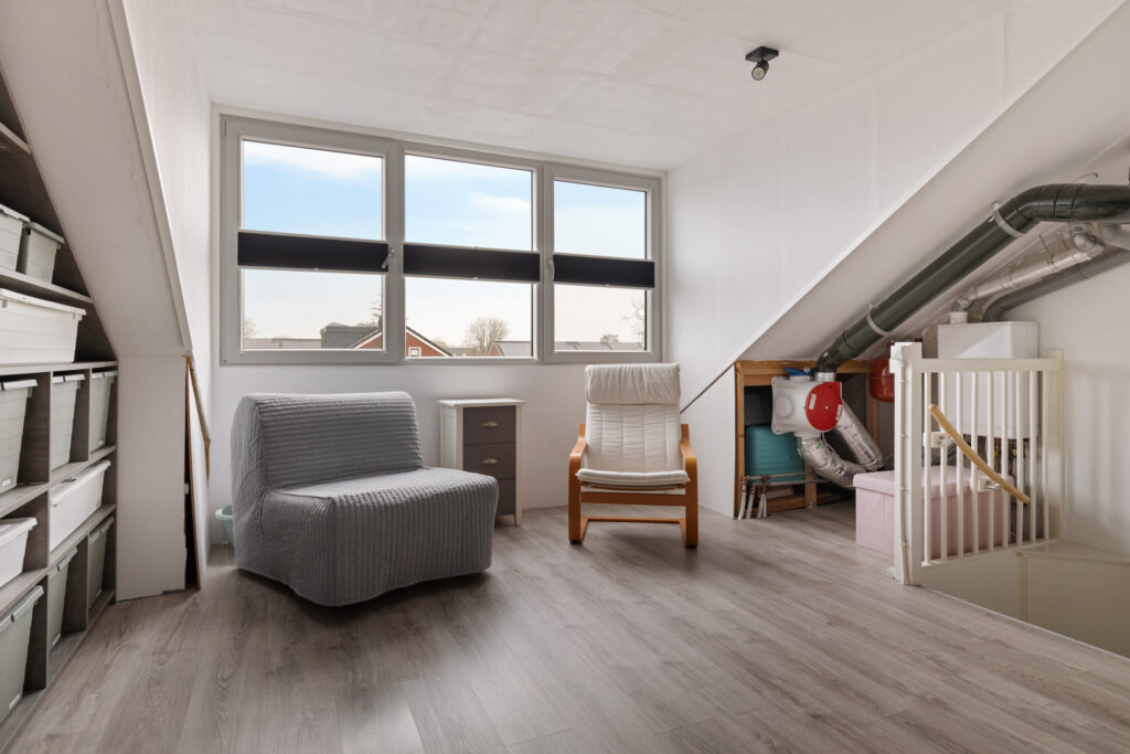 Vaste trap naar de tweede verdieping, waar een mogelijkheid is om een vierde slaapkamer te creëren van ca. 22 m² welke voorzien is van een groot dakkapel voor extra ruimte en lichtinval en een laminaatvloer.