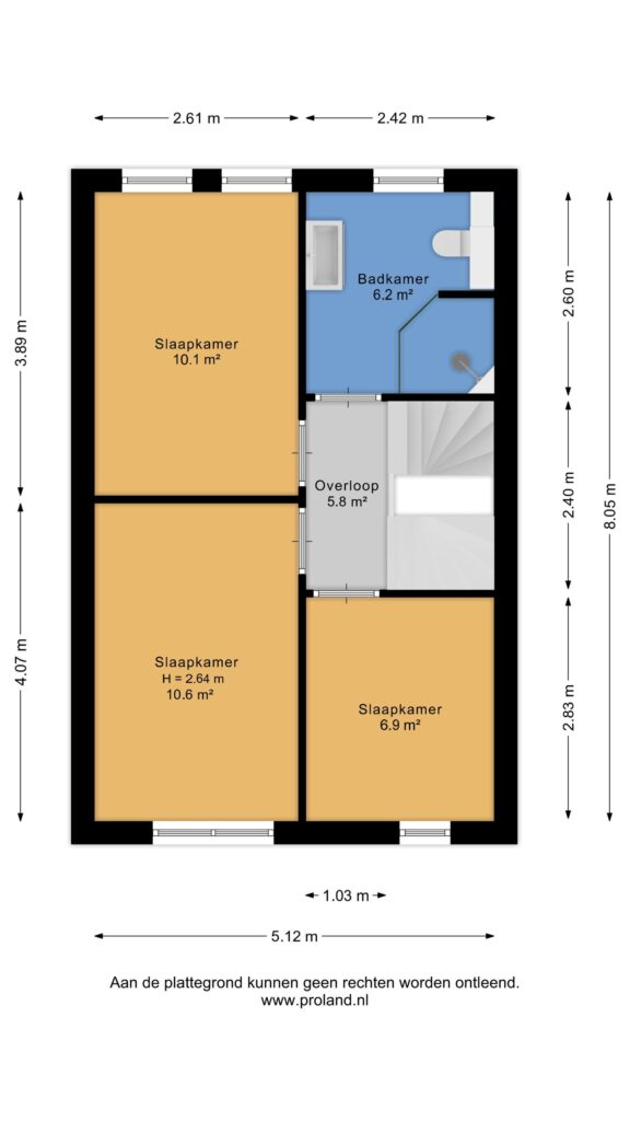 Overloop met toegang tot 3 slaapkamers van ca. 7, 10 en 11 m² en de badkamer van ca. 6 m² met wastafel met meubel, een tweede toilet en doucheruimte.