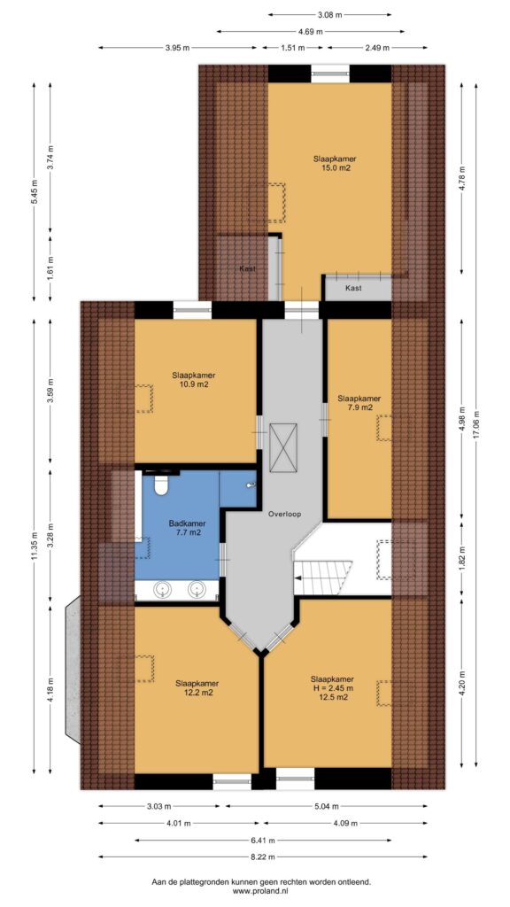 Op de verdieping middels een overloop toegang tot 5 slaapkamers van ca. 8, 11, 12, 12 en 15 m² en de badkamer. De badkamer van ca. 8 m² is voorzien van een ligbad, douche, tweede toilet en dubbele wastafel. De bergzolder is te bereiken middels een vlizotrap op de overloop. De gehele bovenverdieping is voorzien van een laminaatvloer.