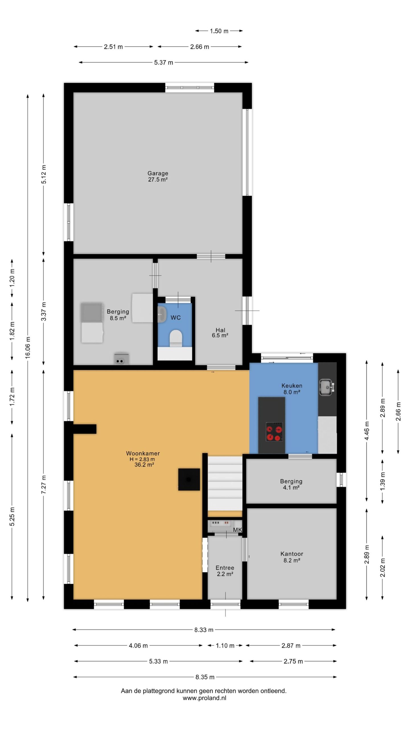 Entree, hal met toegang tot een werkkamer van ca. 8 m² en de woonkamer van ca. 36 m² met laminaatvloer. Aangrenzend de open keuken van ca. 8 m² met inbouwapparatuur zoals inductiekookplaat met afzuigkap, combi-oven, koelkast en vaatwasser. Vanuit de keuken toegang tot een inpandige berging van ca. 4 m² en toegang tot het achterhuis met hal, toilet, berging van ca. 8 m² en de ruime garage van ca 27 m², deze is eventueel geschikt om een 4e slaapkamer & badkamer te realiseren, zodat je een compleet woonprogramma hebt op de begane grond.