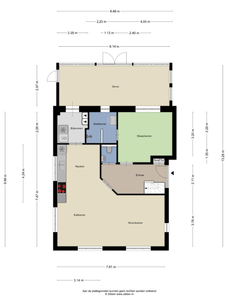 Entree, centrale hal met toilet, trapopgang naar de verdieping en toegang tot de woonkamer van ca. 30 m² met aansluitend de open keuken van ca. 13 m². De keuken is voorzien van een inductiekookplaat met afzuigkap. Vanuit de keuken toegang tot de bijkeuken van ca. 5 m² met wasmachine-en drogeraansluiting, de CV opstelling en een doorgang naar de serre van ca. 24 m² waar je middels tuindeuren toegang hebt tot de achtertuin. De slaapkamer van ca. 13 m² met aansluitend de badkamer van ca. 5 m² zijn ook te bereiken vanuit de centrale hal. De badkamer is voorzien van een inloopdouche met sunshower, infraroodpaneel, wastafel en vloerverwarming. De begane grond m.u.v. de badkamer en toilet is voorzien van een PVC vloer.