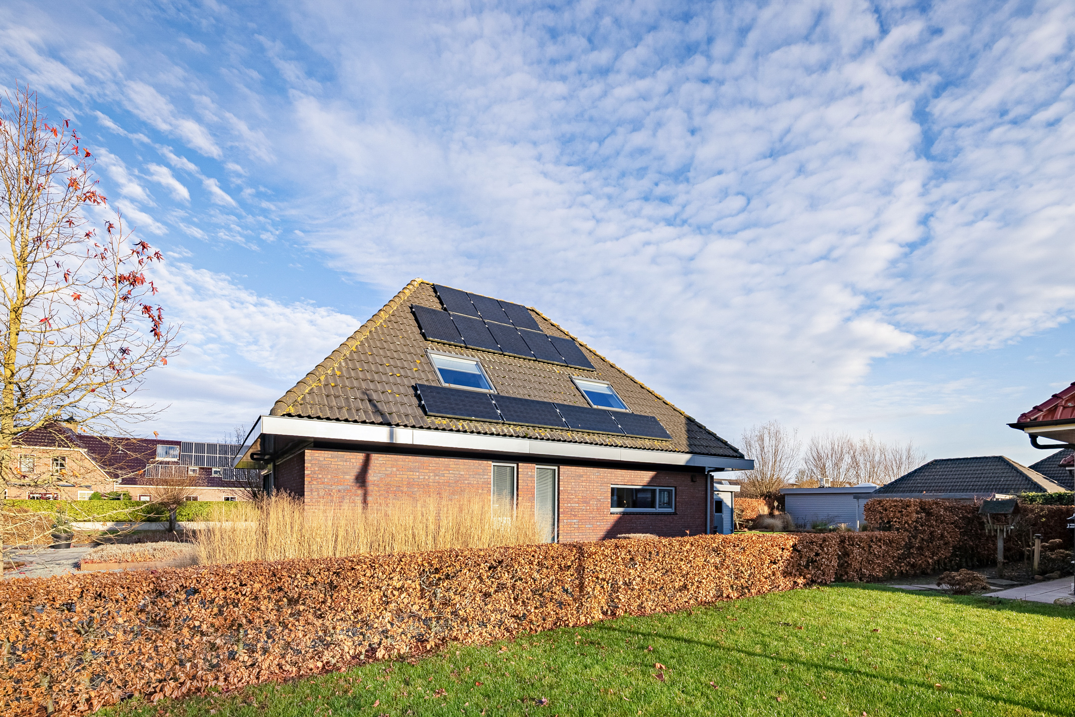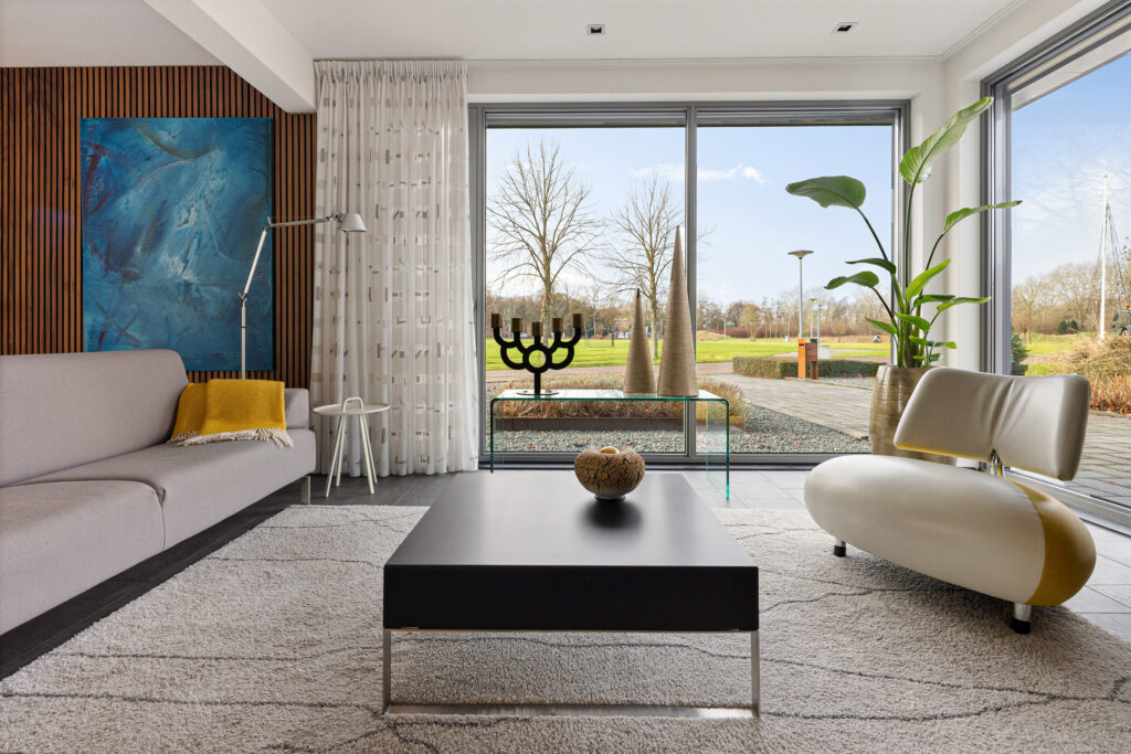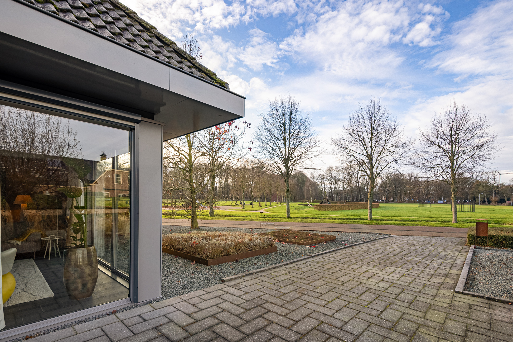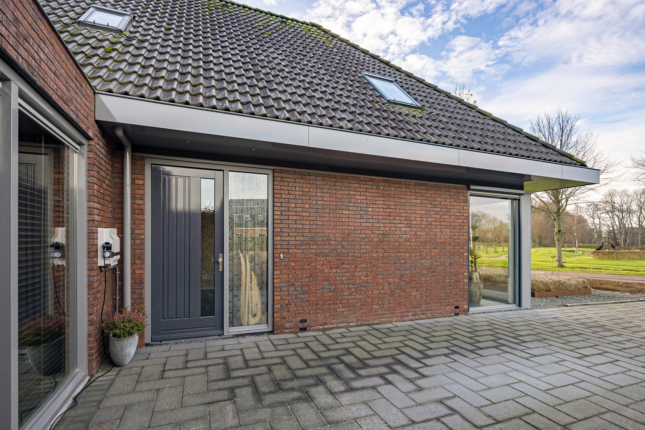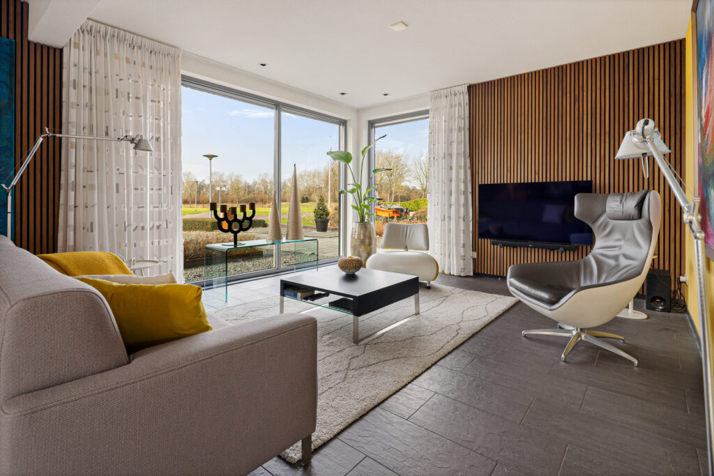 Tegenover de woning strekt zich een grote groene weide uit met o.a. een speeltuintje en een hertenkamp met daarachter het prachtig decor - de karakteristieke "Menkemaborg". Vanuit je woonkamer geniet je van dit fraaie en rustgevende panorama, wat bijdraagt aan een gevoel van ruimte en vrijheid.