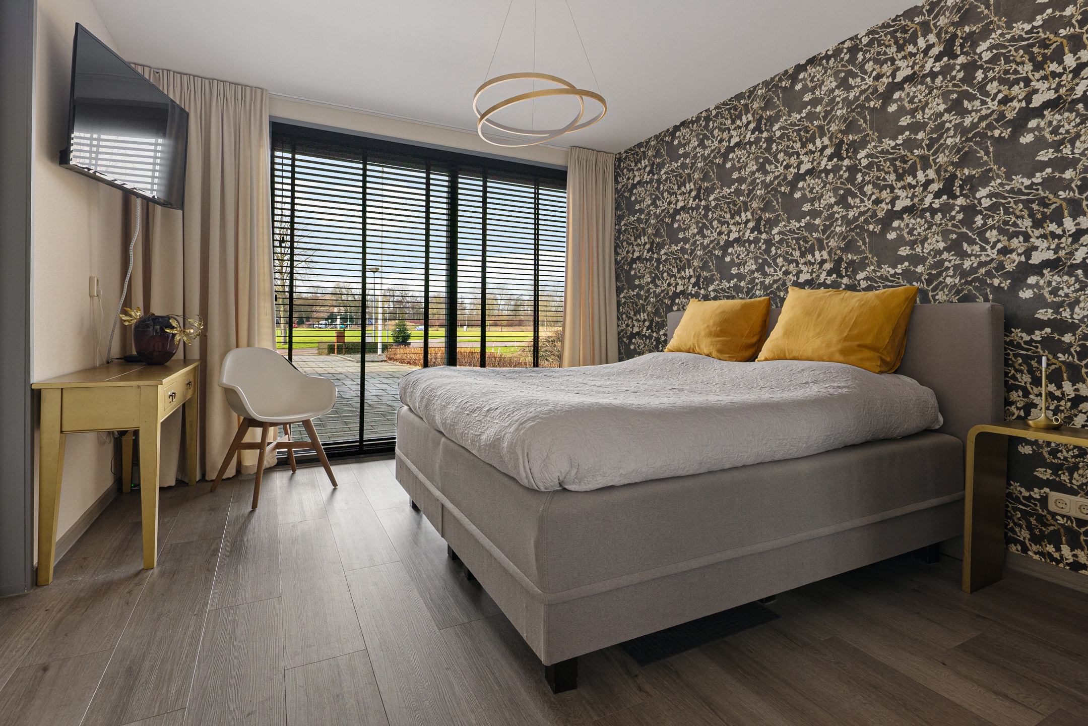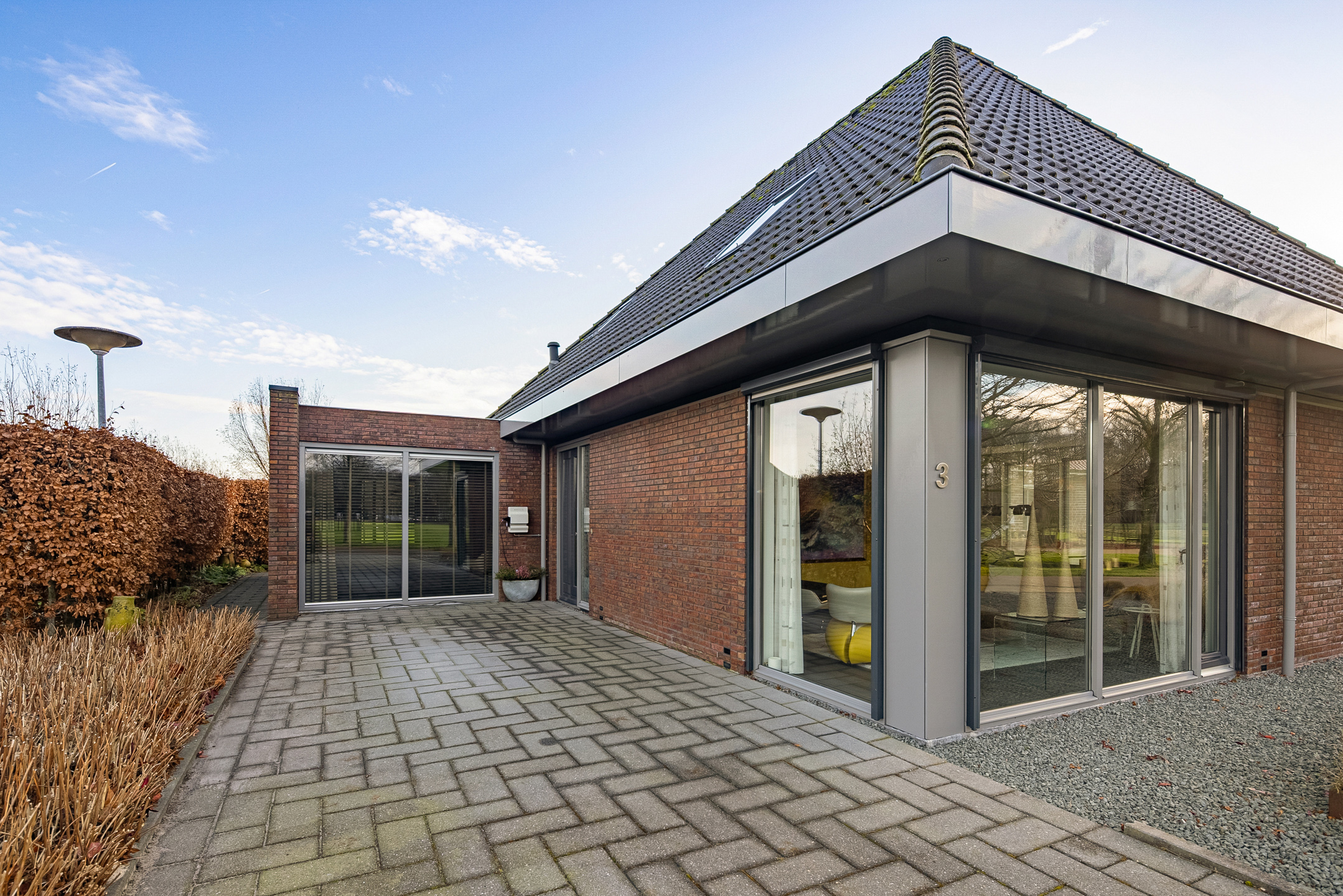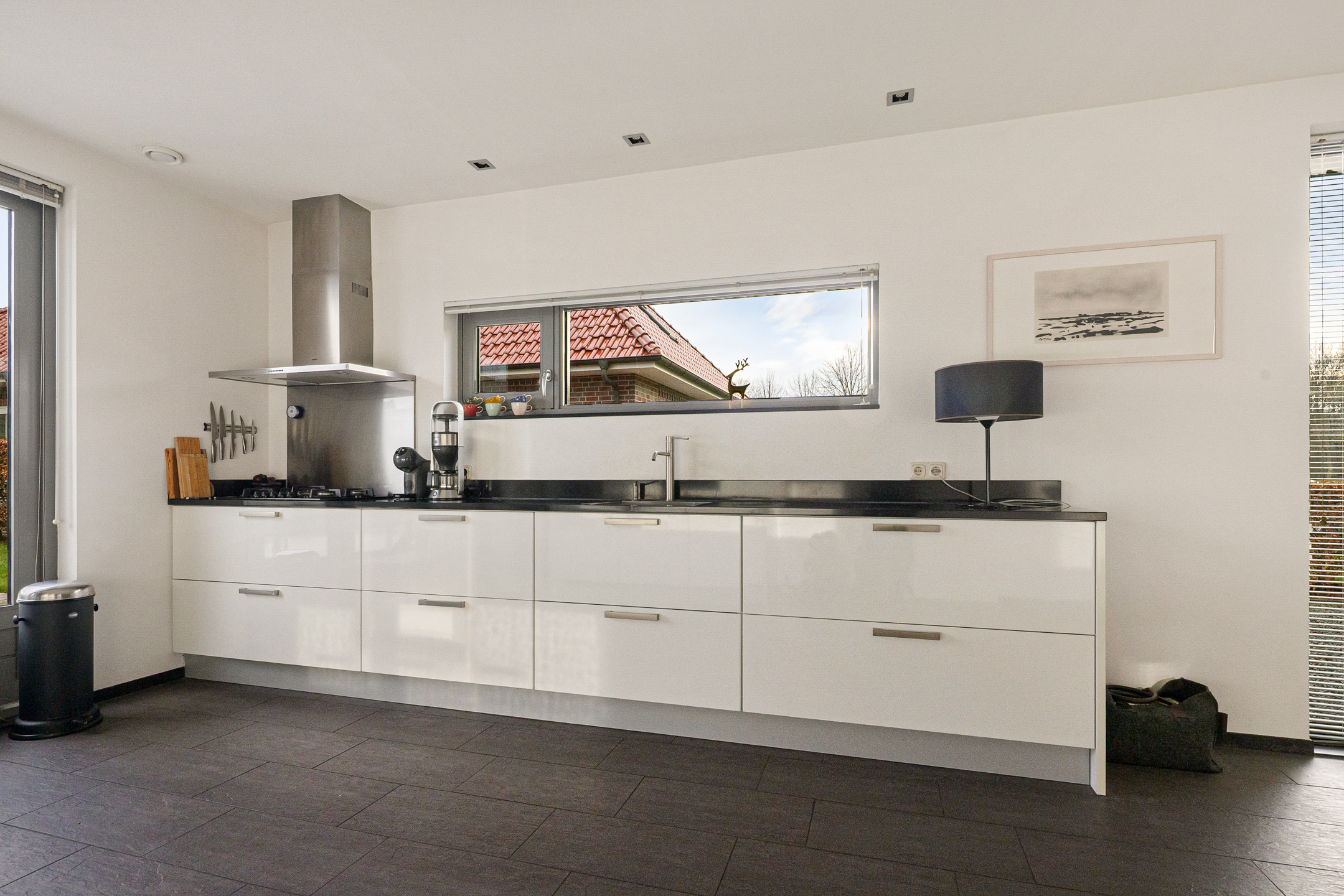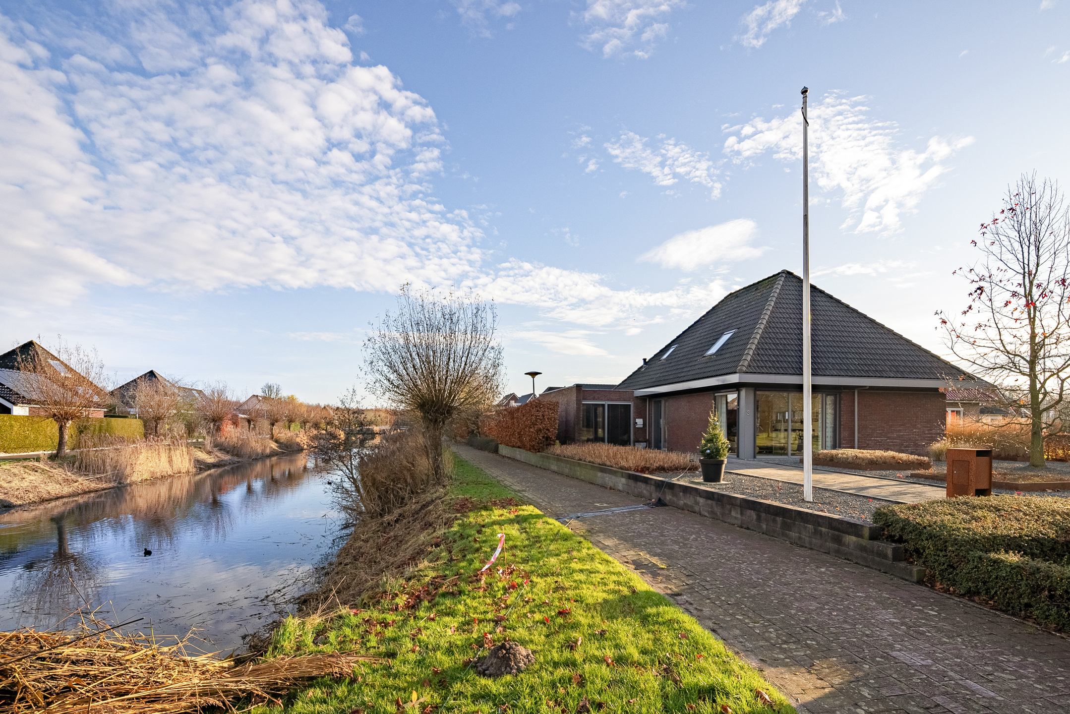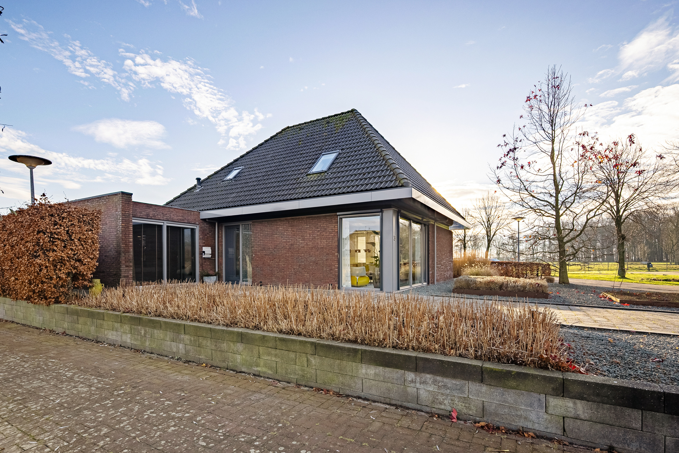 Tegenover de woning strekt zich een grote groene weide uit met o.a. een speeltuintje en een hertenkamp met daarachter het prachtig decor - de karakteristieke "Menkemaborg". Vanuit je woonkamer geniet je van dit fraaie en rustgevende panorama, wat bijdraagt aan een gevoel van ruimte en vrijheid.
