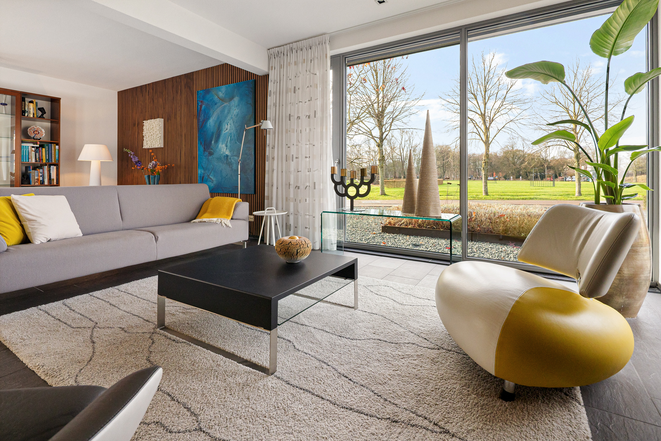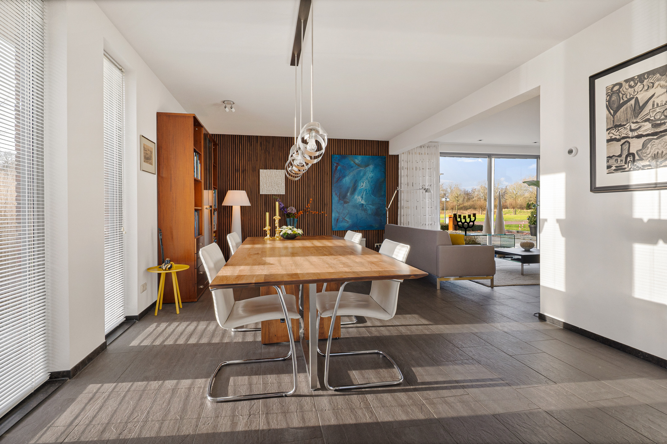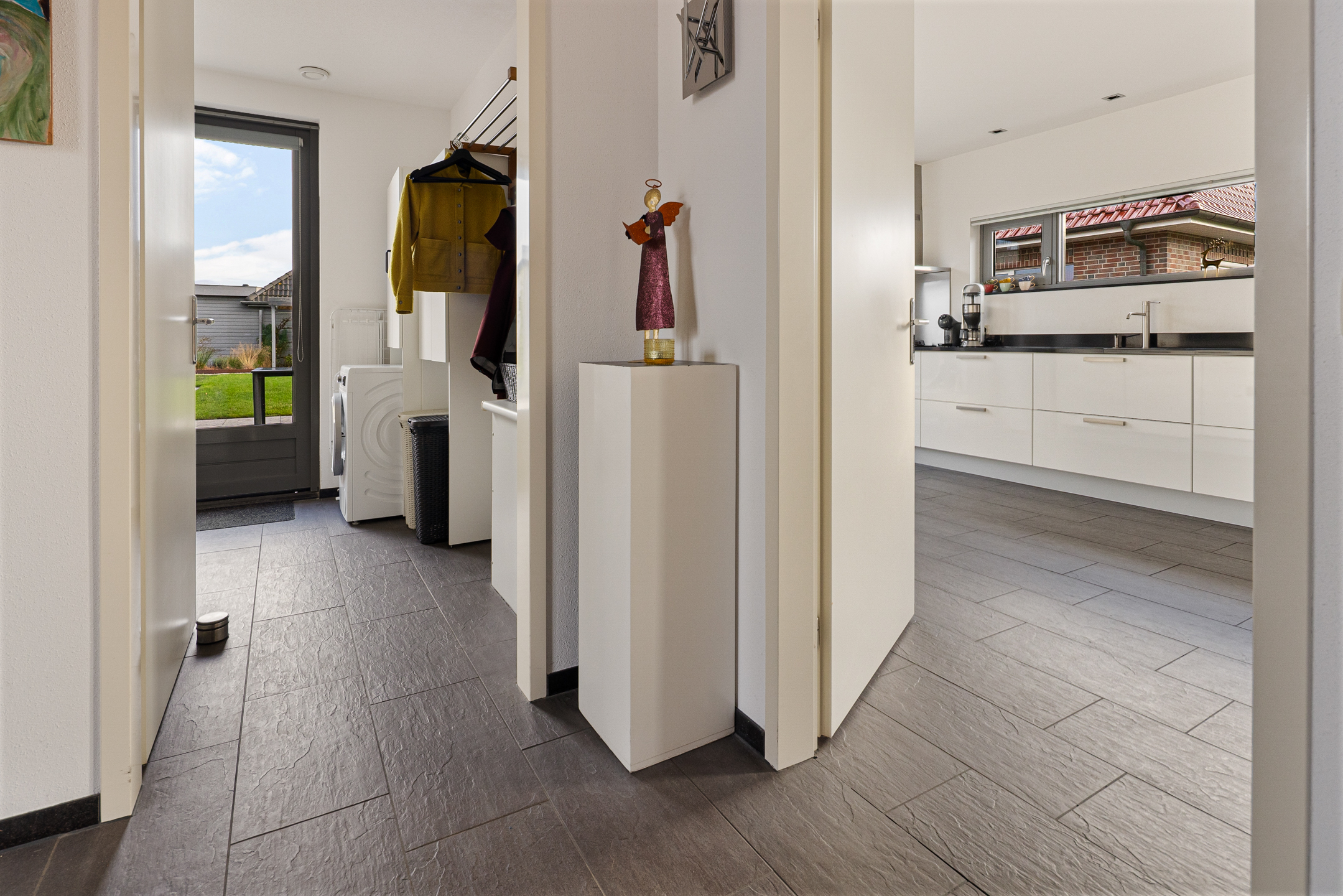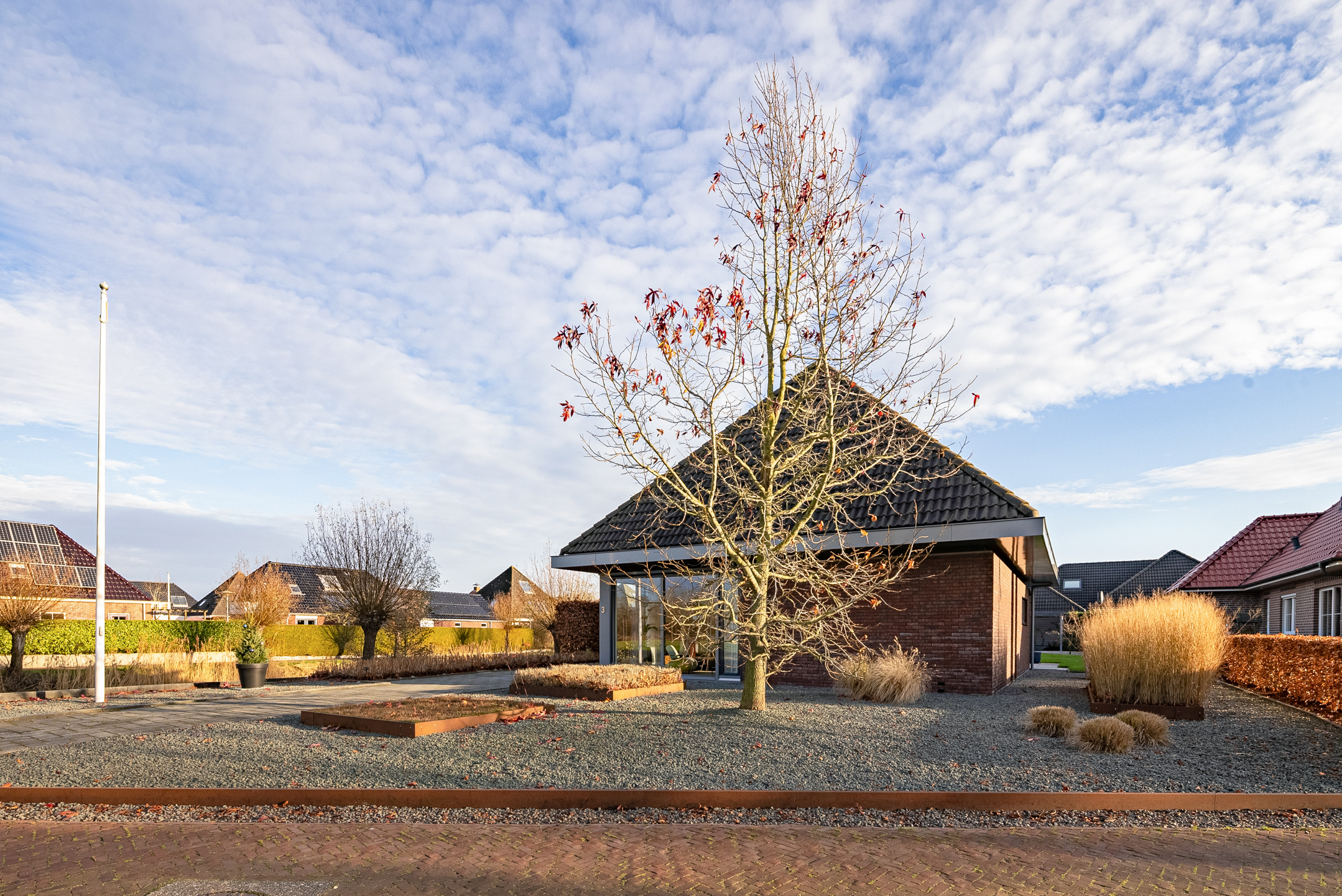 Tegenover de woning strekt zich een grote groene weide uit met o.a. een speeltuintje en een hertenkamp met daarachter het prachtig decor - de karakteristieke "Menkemaborg". Vanuit je woonkamer geniet je van dit fraaie en rustgevende panorama, wat bijdraagt aan een gevoel van ruimte en vrijheid.