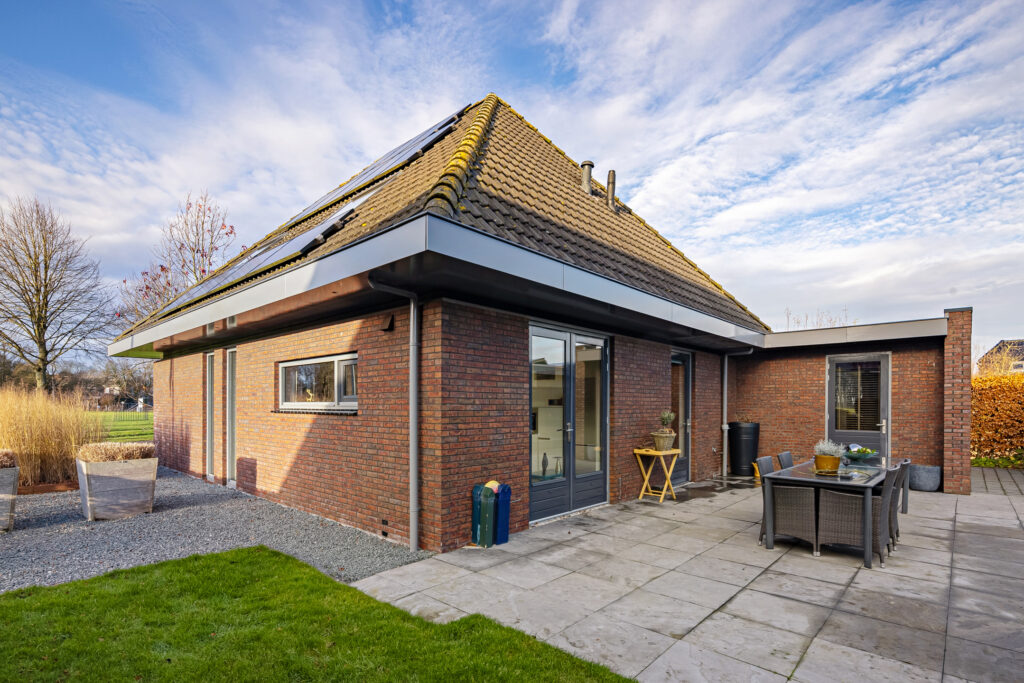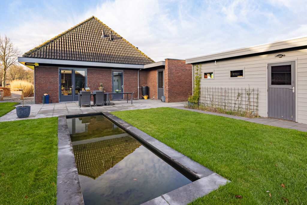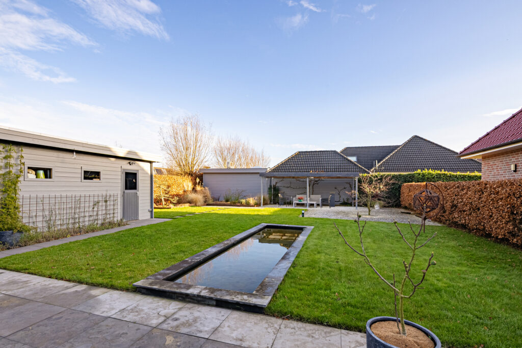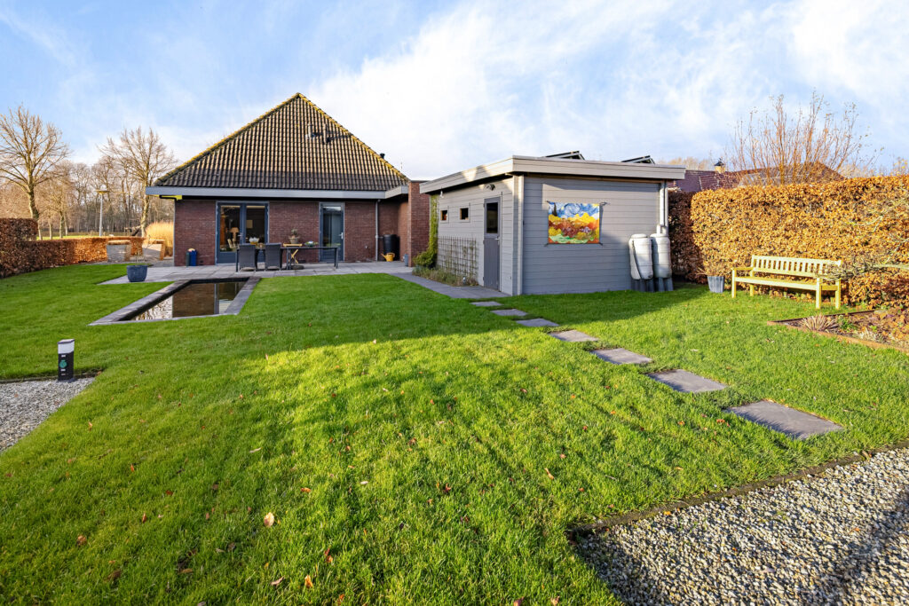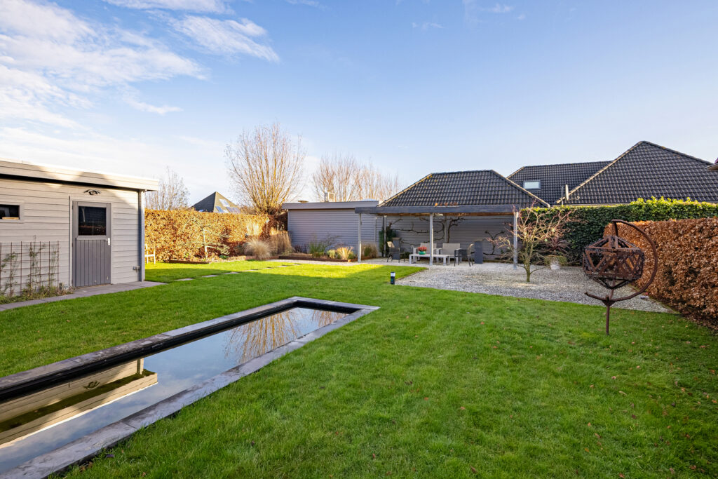 Rondom de woning ligt een verzorgde tuin die uitnodigt tot ontspanning en genieten. Een praktische tuinberging biedt ruimte voor tuingereedschap en extra opslag. Het vijvertje vormt een rustgevend element en zorgt voor een natuurlijke sfeer. Daarnaast is er een overkapping, ideaal om ook bij minder gunstige weersomstandigheden of tot late zomeravonden comfortabel buiten te vertoeven.