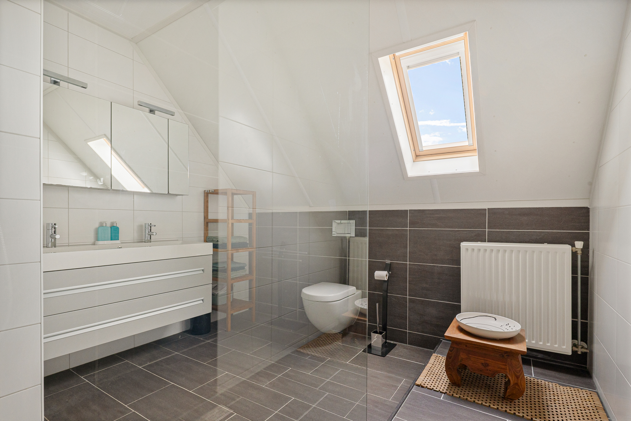 Verdieping: via de overloop heb je toegang tot 3 ruime slaapkamers van ca. 10,12 en 13 m² en de 2e badkamer (ca. 8 m²) met douche, dubbele wastafel en toilet.