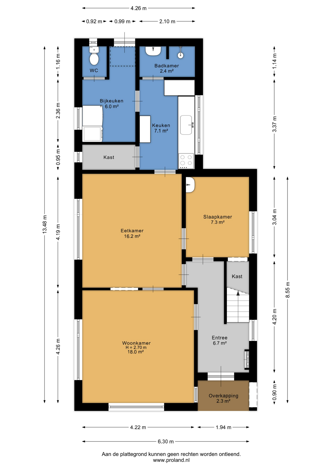 Entree, hal met trapopgang, slaapkamer van ca. 7 m², woonkamer van ca. 18 m², eetkamer van ca. 16 m², keuken van ca. 7 m² met o.a. inductie kookplaat en koelkast. Vervolgens een badkamer met wastafel en douche, de bijkeuken met achterentree en toilet. Op de verdieping zijn 3 slaapkamers van ca. 6, 7 en 11 m² met diverse inbouwkasten. Boven het achterhuis bevindt zich een zolderruimte van ca. 11 m².