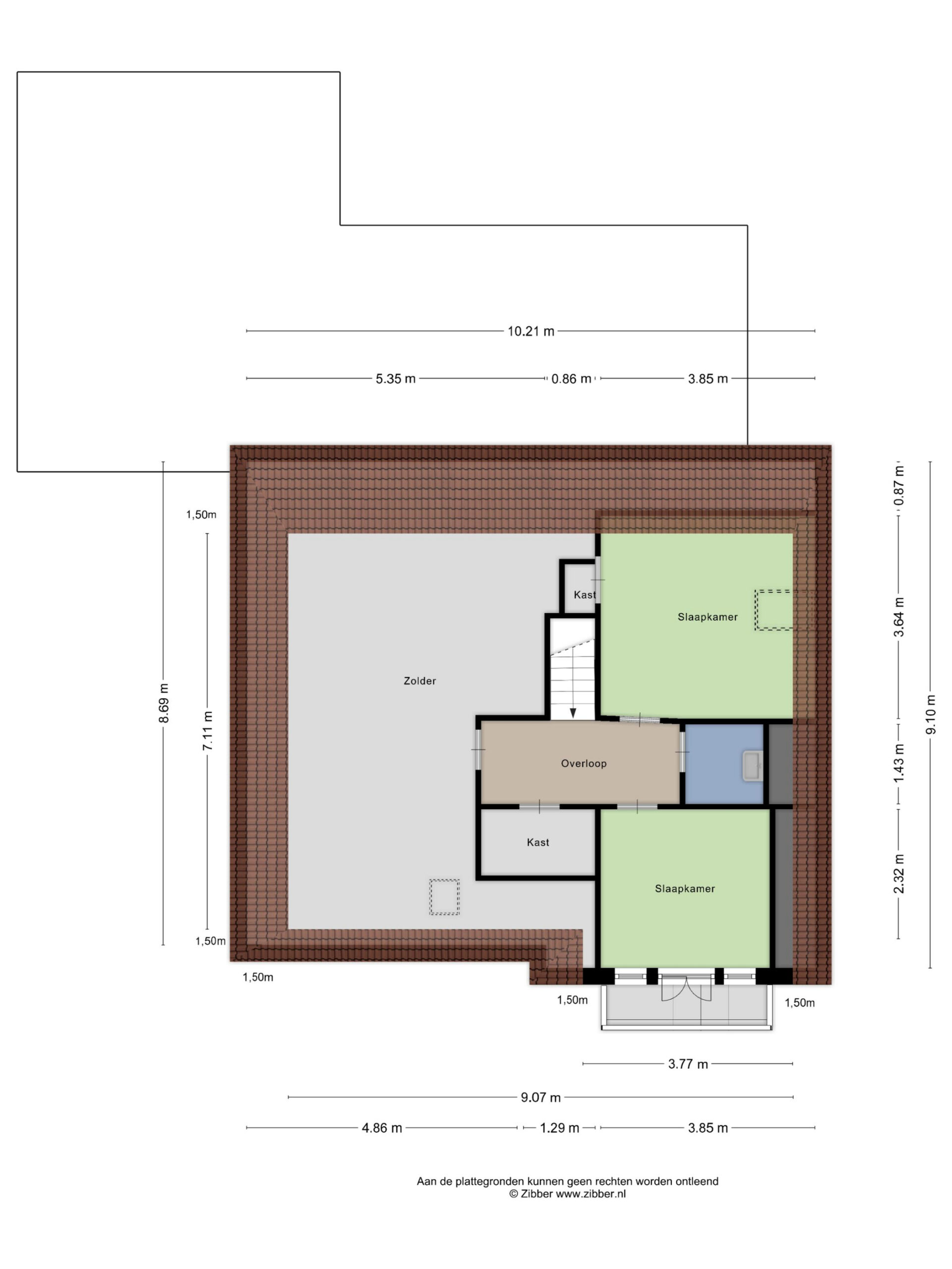 Overloop met twee slaapkamers, sanitaire ruimte met wastafel, bergruimte en een ruime zolder met mogelijkheid tot extra slaapkamer(s).