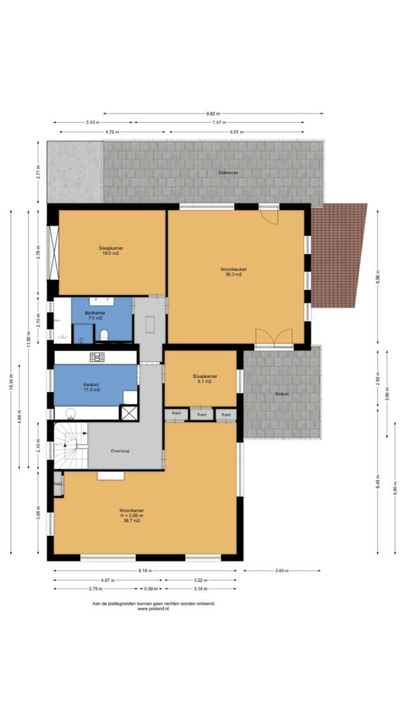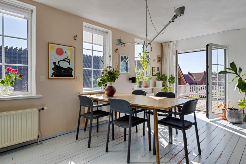 Middels een overloop op de verdieping toegang tot een woonkamer aan de voorzijde van het pand van ca. 37 m². Tevens toegang tot een dichte keuken van ca. 11 m² met inbouwapparatuur zoals gasfornuis met afzuigkap, magnetron, oven en vaatwasser. Twee slaapkamers van ca. 8 en 18 m² en een heerlijke living (woonkeuken) van ca. 36 m² waar je middels openslaande deuren toegang hebt tot een ruim balkon van ca. 13 m² (zuidoosten) en aan de achterzijde (middels een deur) een dakterras van ca. 27 m² (noord).