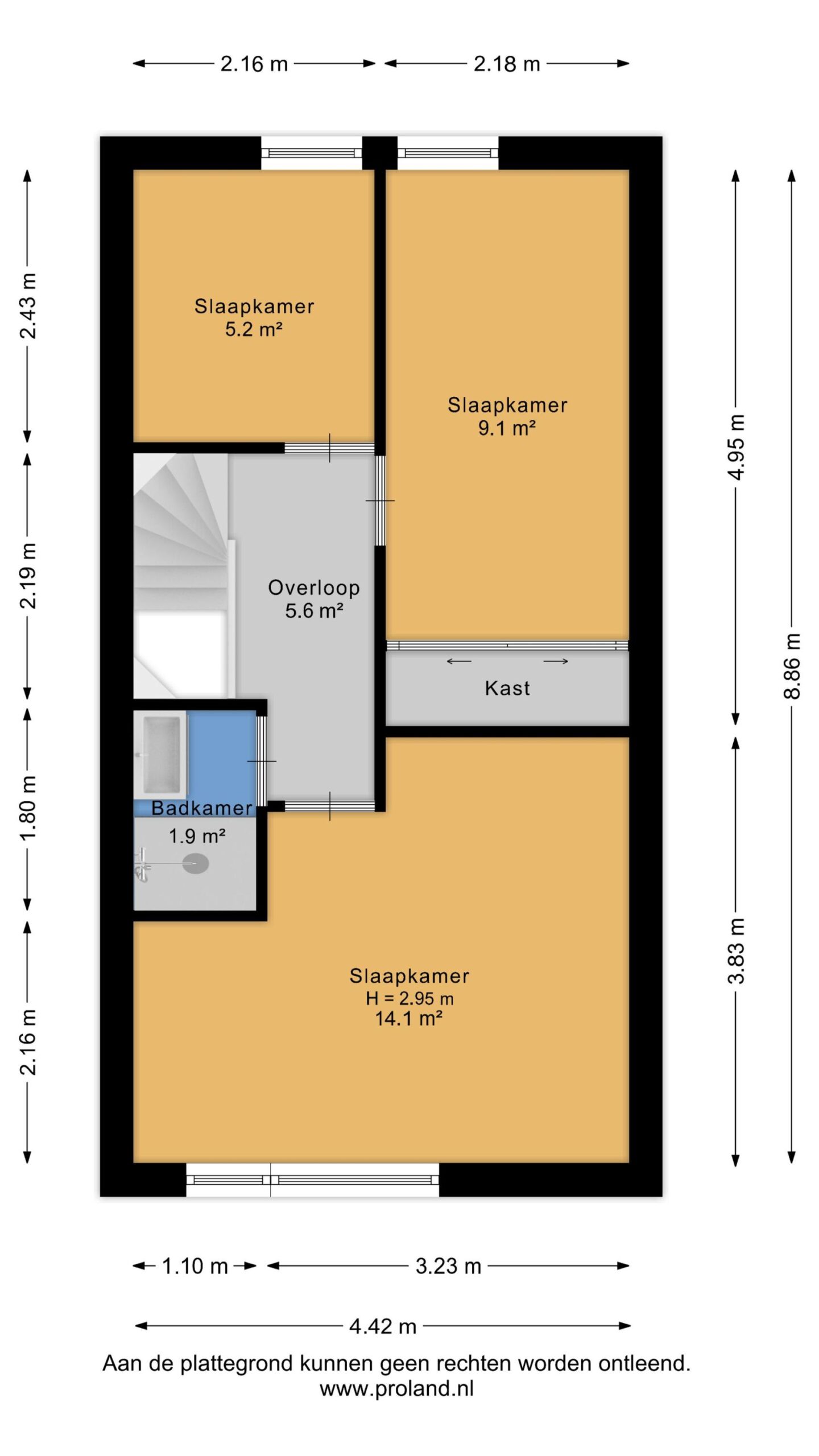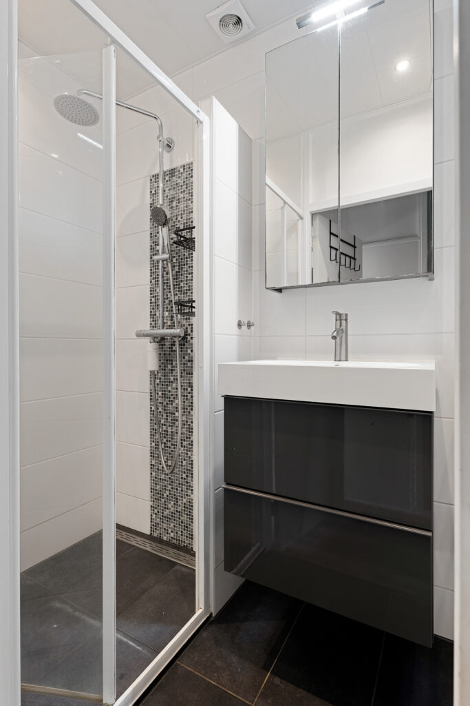 Verdieping: via de overloop heb je toegang tot 3 nette slaapkamers van 5, 9 en 14 m², waarvan 1 slaapkamer beschikt over een vaste kastwand. De badkamer is voorzien van een wastafelmeubel en een douchecabine.