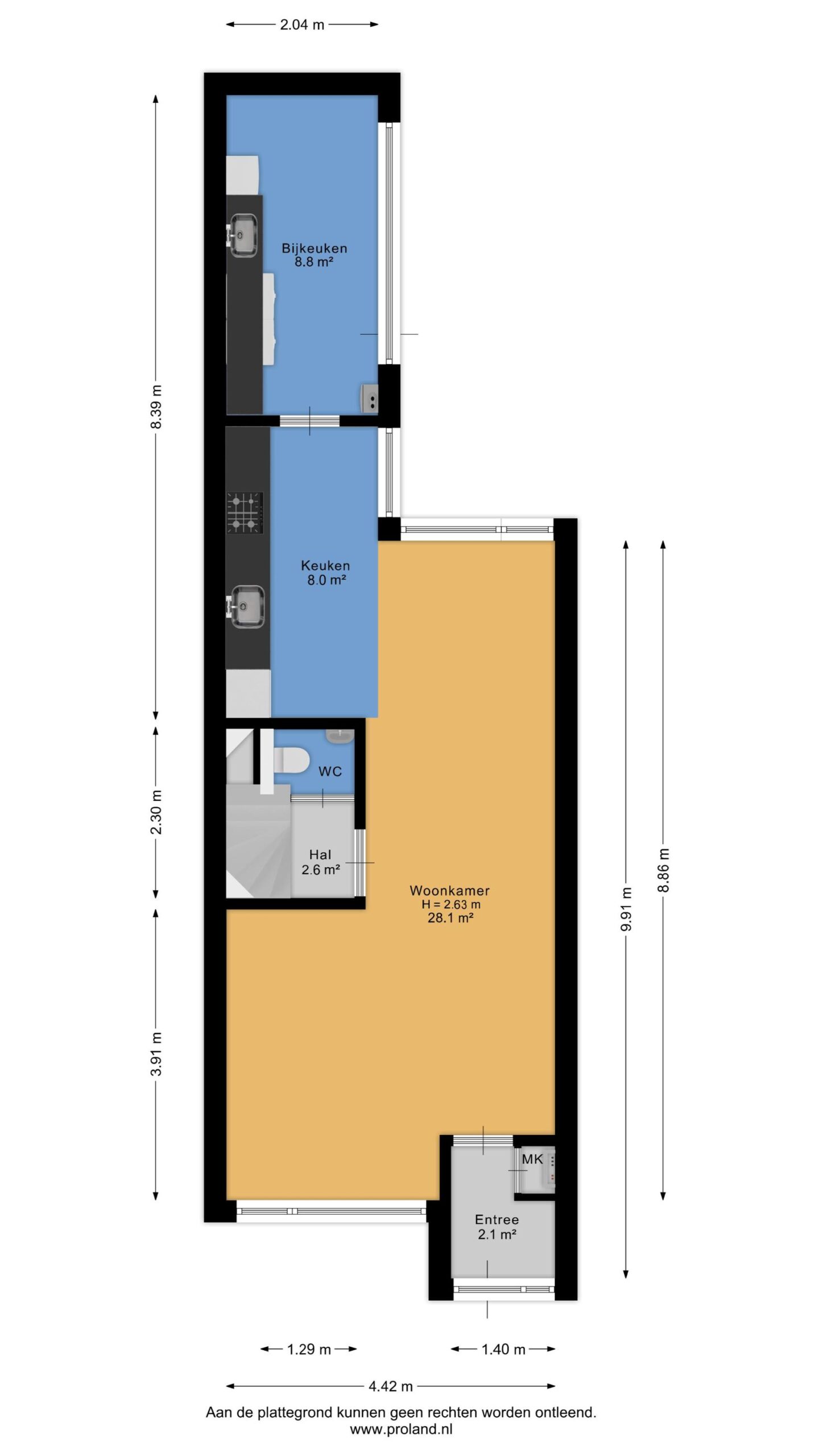 Entree, hal met meterkast en toegang tot de L-vormige woonkamer van ca 28 m² met laminaatvloer, (gesloten) trapopgang naar de verdieping, modern toilet met fonteintje. Half open keuken (ca 8 m²) met inbouwapparatuur te weten: gasfornuis, combimagnetron, vaatwasser en koel/vriescombinatie. Vervolgens de bijkeuken met plavuizen, cv opstelling en wasmachine/droger aansluiting. Vanuit de bijkeuken heb je toegang tot het terras.