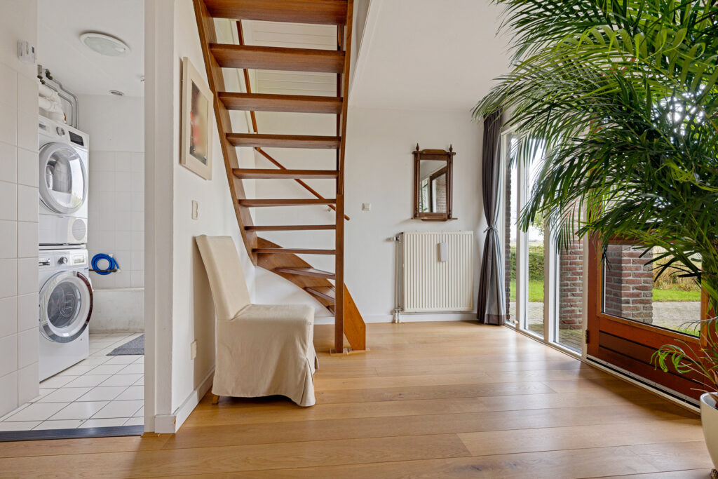 Entree met overkapping, hal met veel lichtinval en trapopgang naar de verdieping. Toegang tot het toilet, de bijkeuken en de badkamer (met douche en wastafel) en tenslotte de L-vormige woonkamer (ca. 42 m²) met een half open keuken (ca. 10 m²) voorzien van inductiekookplaat, vaatwasser, koelkast en combi-magnetron.