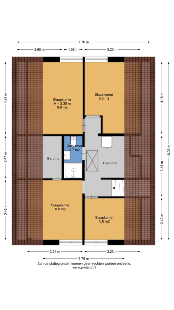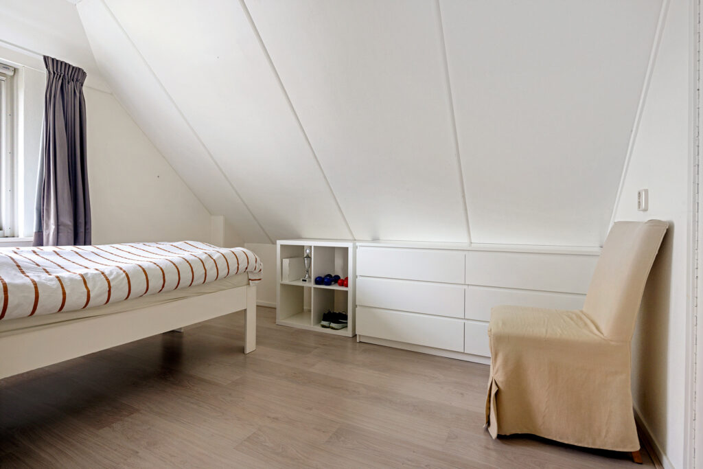 Op de verdieping 4 slaapkamers van ca. 7, 8, 9 en 10 m² en een 2e badkamer met douche, wastafel en 2e toilet. Naast de badkamer heb je een functionele berging.